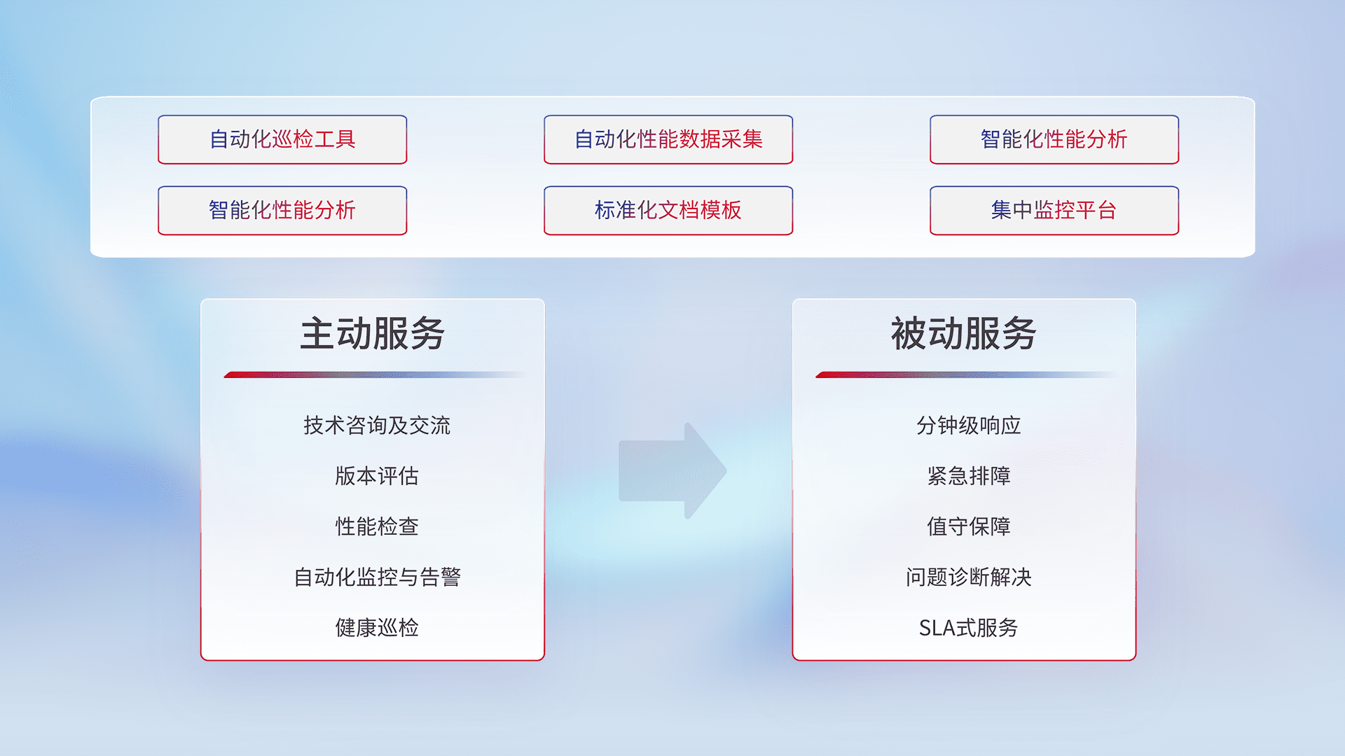 智能化工具和标准化文档,,,保障服务质量,,,,提供主动服务(包含技术咨询、、、版本评估、、、性能检查、、自动化监控与告警、、、、健康巡检)和被动服务包含(分钟级响应、、、、紧急排障、、、值守保障、、问题诊断解决、、SLA服务)。。